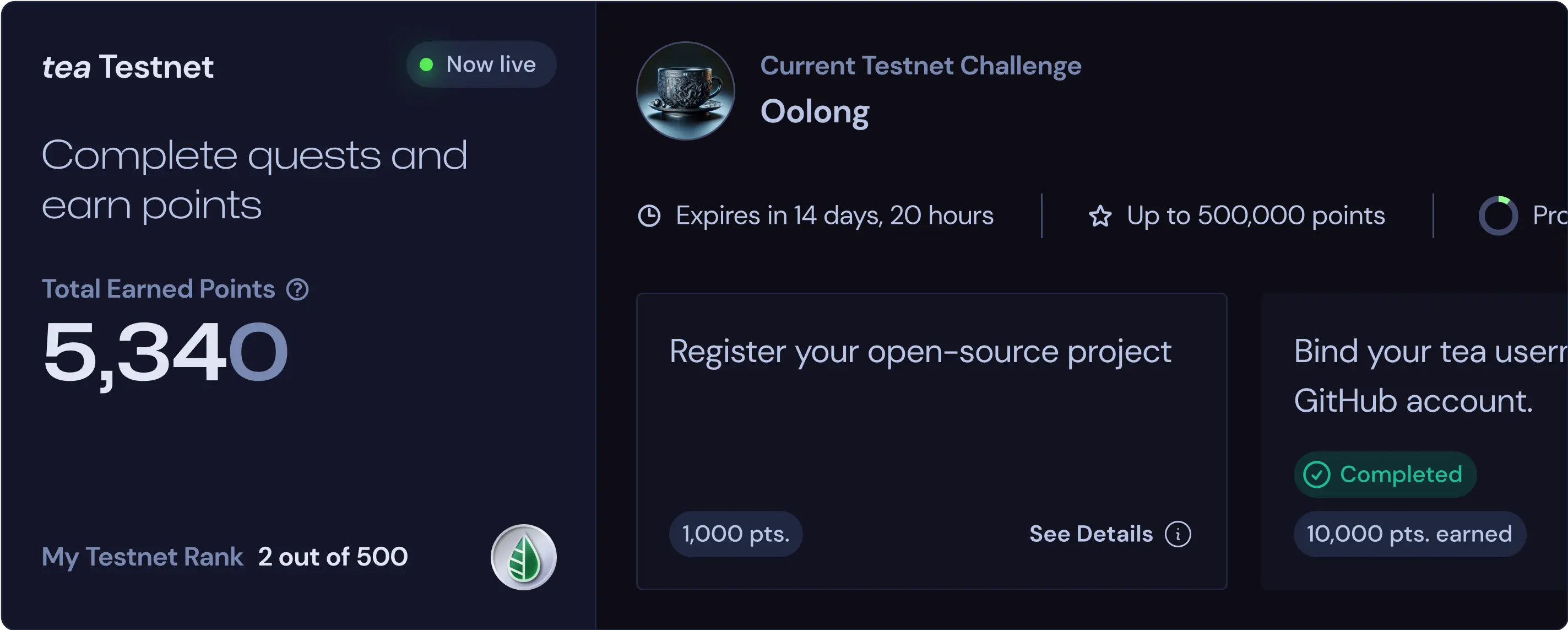 tea's Testnet runs from Wednesday, February 21, 2024 to Wednesday, May 15, 2024.